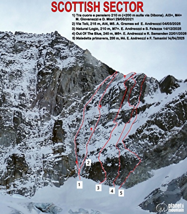 Out of the Blue - Cima BusazzaA highly logical line that climbs the central of the three large parallel corner on the buttress to the right of the main north face. Compared to the "twin" routes...