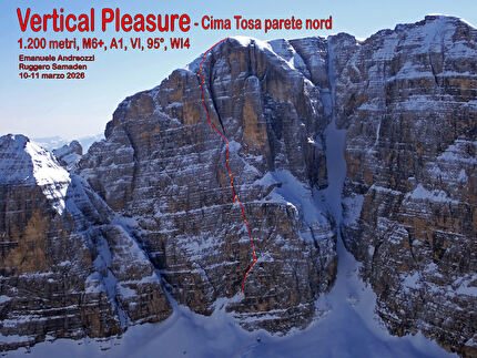 Vertical Pleasure - Cima TosaVertical Pleasure segue un lunghissimo camino che solca da cima a fondo la parete nord-nord-est della Cima Tosa. Si sviluppa in modo quasi del tutto indipendente anche dagli itinerari estivi....