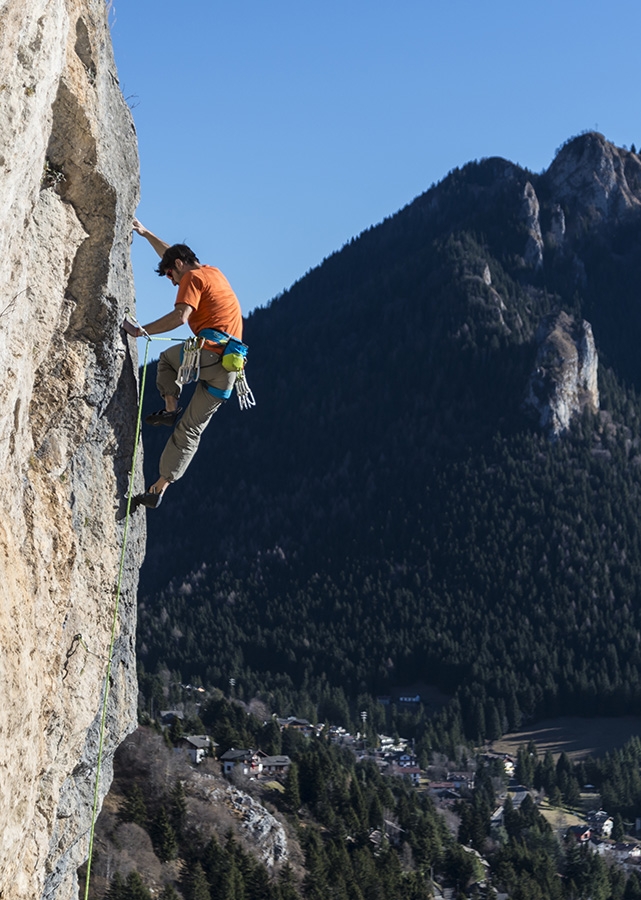 Climbing at the sector Solarium at the crag Corna Rossa above Bratto, Italy