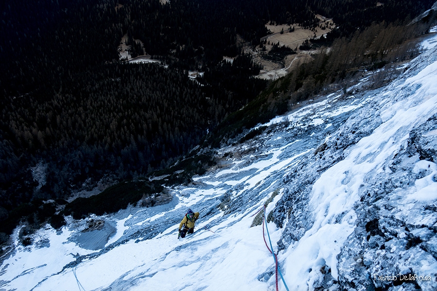 Thomas Gianola seconding easy terrain at the start of All-in up the North Face of Sas del Pegorer, (Gran Vernel), Dolomites (Philipp Angelo, Fabrizio della Rossa, Thomas Gianola 09/01/2017)