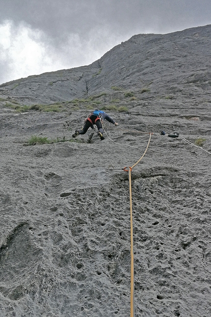 This journey started when we first met Michele at the historic crag La Vela, before our beards grew and when we were still without a driving license. We met two sisters who became our life partners. What followed were many years of shared family lives, of climbing, adventures and some expeditions. Children, work, worries, but climbing was our constant, a magical escape valve. And then we joined forces once again: enthusiastic and motivated, to create something beautiful, to remember a truly beautiful person. Two days we spent establishing the line on a peak we know well, up rock which seemed fitting for the purpose.