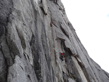 Seen the right start of the route, Andrey progresses with good ability and go through the key tracts irreplaceable fi-fi rock, a sort of ax that he uses also in cracks large also two centimeters. It’s amazing seeing him playing with such a shrewdness in fit and trationate that tool. Arrived at the supposed belay, he starts hammering and equipping it properly. As a matter of fact in Norway the ethic forces not to put fix but let everyone prepare his own belay. Two ropes, one attached to the top and the other used to recover and belay the following climber. Alexey cleans the pitch from every protection except a titanium piton, which will be useful the day after to go up again; so he is at the belay with Andrey and he belays him also for the next length.