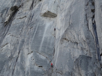 From the tents I can see the sun but I wear a long-sleeve t-shirt, a fleece and a windcheater; I wait for them till they finish the second length. As they come back on the ground we return to our little corner of paradise, we are still in five people and we are going to eat for the last time all together, as a matter of fact Maxim and Ivan have prepared their portaledge and they will spent the day after on the wall.