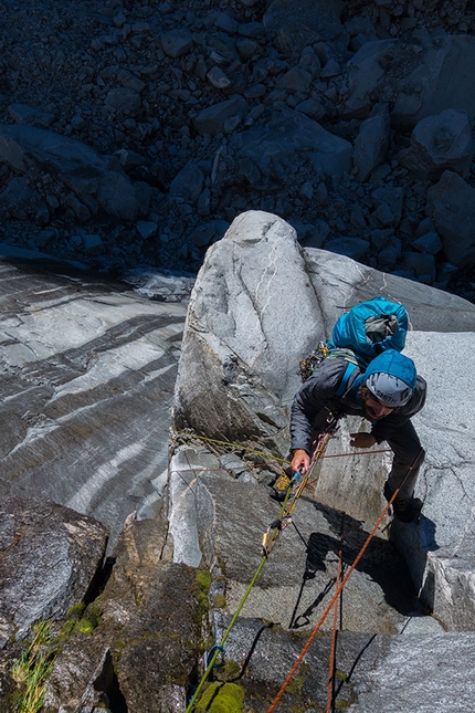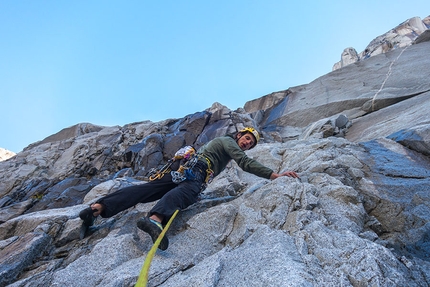 We started climbing before dawn and climbed the most delicate and uncertain pitches in the morning, breaching the roofs on the starting pitches. In the middle of the face some rockfall due to melting snow on the summit convinced us to keep moving as quickly as possible and remain sheltered below the overhanging headwall. Wet to the bone we managed to identify the right line of cracks to the summit, the only one as it happens, and continued climbing following the lights of our headtorches. After 16 hours we on the trot we reached the summit at 2:00am the next morning.