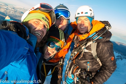 The four climbed efficiently and summited late in the afternoon. While in 1999 Siegrist had not climbed the final 10m rime ice mushroom on top of the summit plateau due to prohibitive conditions, this year conditions were ideal and all four reached the summit proper. Siegrist explained "Last time we did without the circa 10m high rime mushroom due to an incoming storm. At the time it made absolutely no difference to us. But things were different this year: no wind on the summit! We climbed the easy last 10m from the summit plateau onto the highest point. Another unforgettable experience in Patagonia! We're overjoyed!"