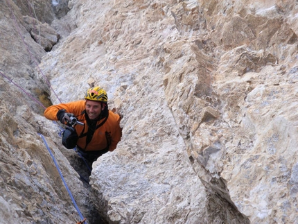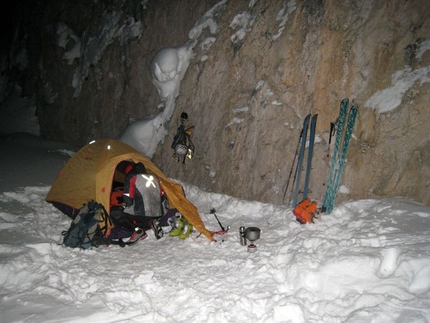 In 2009 I finally met someone who like me wants to get to grips with routes which are committing. I met Massimo Laurencig while becoming a Mountain Guide and when I sent him an email with a photo and just a few words of explanation he replied enthusiastically, all we needed to do was decide when. We departed without a rush Thursday afternoon and reached the base of the climb in three hours where there is a comfortable bivvy directly beneath the route, well sheltered from the "bombs" of snow and rock which fall during the day. On 13 March we decided to climb at least 150m, fist the ropes and descend to climb the entire route.