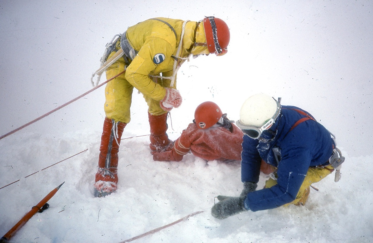 Getting up there had proven epic, but getting down was not going to be easy, either: there were no rocks on the summit to make the rappels and they had to improvise a snow anchor of sorts. Using snow stakes and some etriers they built an anchor, looped the ropes around it and then buried it all with a lot of pressed snow: it really did look like a snowman!
