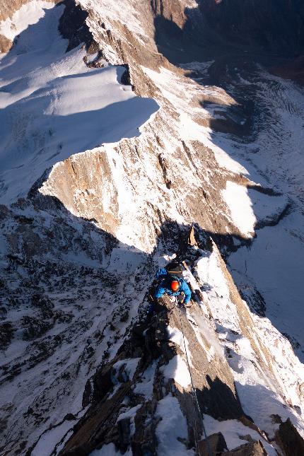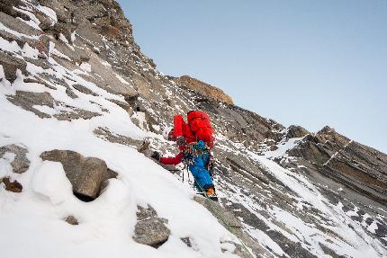 Day 3 started with more sketchy climbing across slabs covered by 50cm of fresh snow, which led to steep and technical rock and ice pitches up the spur. The original plan had been to reach the final snow slope that day but the climbing proved so demanding that they were forced to bivy 250m below the snow slope. Unfortunately, they failed to fined a place to pitch their tent and they therefore spent the night sitting on a tiny snow ledge with their feet dangling into the void. Located 1100m above the valley floor, this "has not been our best night ever."