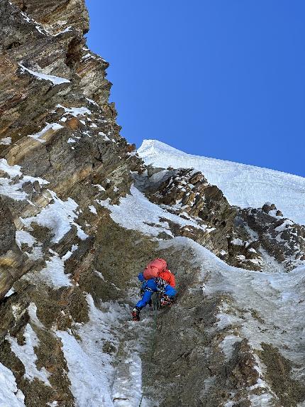The next morning they woke up, or, "more precisely, we stood up", at 4am and continued where they had left off, dealing with steep technical rocky pitches throughout the entire day. They reached the final slope just before sunset; full of ice instead of snow, they rapidly made their way to the summit, which they tagged in the dark at around 7pm.