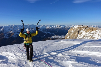Papert explains "We took the direct line up ice that formed this year and the signs of other climbers disappeared. Thin, difficult to protect ice, was just good enough to enable us to always follow a direct line up the steep face. Each pitch held a surprise and offered more challenging climbing than expected. Soon the steep wall turned into a gully that we followed to the end. A few hundred meters higher we reached the summit of Cima Tosa at 16 o'clock and had just enough light to find the descent (3 rappells) on the south side. At about 7.30 pm we reached our little tent, packed up quickly and ran back down to the valley for a pizza."