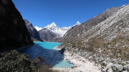 The mountain of Aguja (5840 m.a.s.l.) was our choice for acclimatization. It is situated above the beautiful Laguna Parón (4200 m.a.s.l.), what is a favorite destination of one day trips from Huaraz. We slept below the Aguja at 4800m.a.s.l. with an amazing view onto the Huandoy face. We went for a walk to the altitude of 5000m while looking at the face for some potential goals.