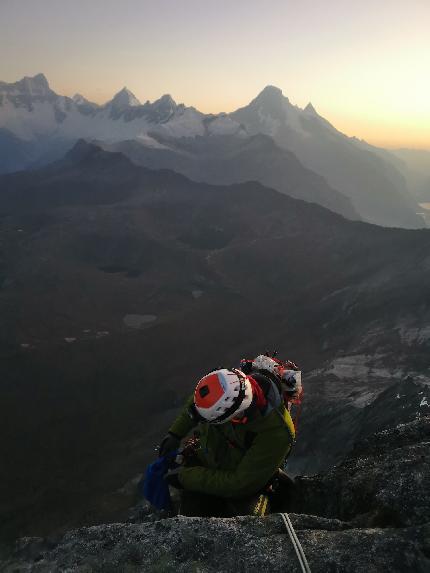 We had a feeling that the summit was not far off and we knew that final part would be without snow. So, I put aside my ice tools but kept one axe in my hand instead of a hammer. Then unfortunately I was faced by a rather unpleasant wall with a hand-jamming crack and bad footholds. Moreover, there was a loose rocky blocs the size of a “fridge and freezer”. But there was no choice, I had to put my feet on it. Fortunately everything went well, after which I completed the final pitch at 6b once again and then we enjoyed an amazing spectacle on the summit. The sun was setting as we reached the highest point and we observed the surrounding mountains tinted yellow and red. The sun set at 6 pm and a long rappel descent lay in store. Before having started our climb we had identified a section of the wall to rappel down and reach the couloir and then the glacier. We thought that it would be nice, but 14 rappels took us 6 hours and it was not pleasant in the slightest. We had run out of water a long time ago, fortunately though we had enough sweet snacks.