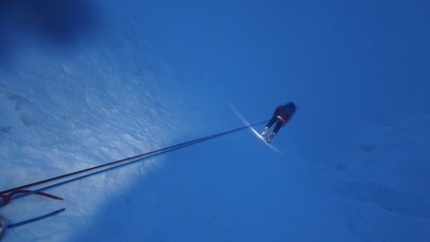 Due to high avalanche risk the high camp was abandoned in bad weather and never occupied again. Despite several areas of the high glacier basin close to the wall seeming safe, seracs falling 1,000m straight from the top of the north face were capable of launching ice and snow projectiles for several hundred meters across the entire area. The decision to abandon our high camp was taken after it was hit by strong winds and heavy spray from a serac avalanche, and a few TV-sized chunks of ice were found just meters away of our tent.
