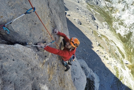 Just to give a concrete example: while at 8a+ the third pitch is considered the technical crux, the fifth 7b+ pitch contains the most dangerous climbing, and a fall close to belay could be fatal. In short, in the last 31 years this route hasn’t seen many repeats and, in all likelihood, in its free version it will continue to see little "traffic".