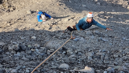 Our start, on day one, was somewhat disastrous and demoralising. We'd noticed a line but, after more than three hours battling up a dirty and difficult pitch, we all decided to give up and try our luck elsewhere. We quickly realised two things: one, that the conglomerate is much more difficult than it looks from below and, two, we wouldn't have got anywhere with our cliff hangers. In a nutshell: you need to drill while holding the slopey pebbles with one hand, hoping that they don't suddenly pop out... talk about thriller!