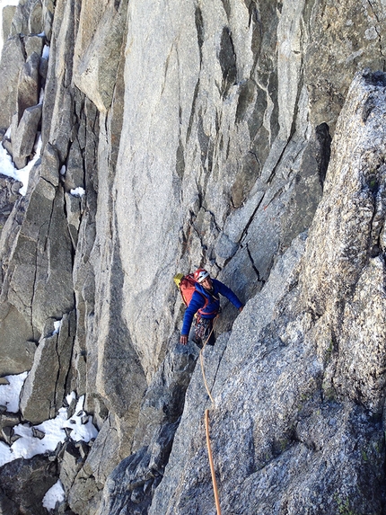 We started ascending the 5c to 6b pitches. Large packs were on our backs, yes, but the rock is solid and, to be honest, I even quite enjoyed it. I could picture myself with my bulky bag, following nice crack lines, setting up belays where suitable. Nevertheless we climbed with a very watchful eye, since there is still a fair bit of rock just asking to snapped off. But for people used to climbing in the Chartreuse, this is nothing new.