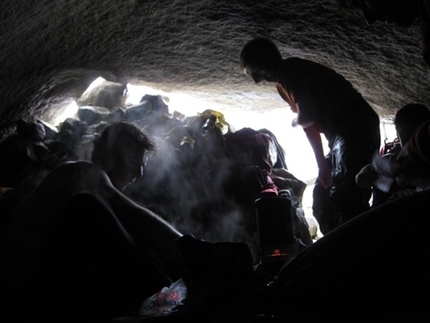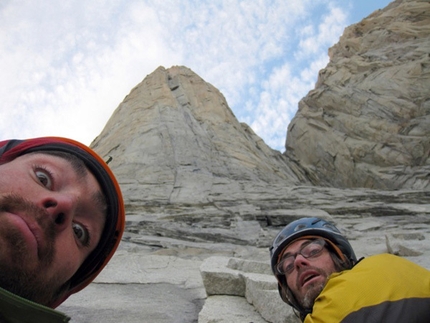 The only info we had about the route was a short description by e-mail and a rough line on a picture. We found it long and sustained, following a series of beautiful cracks and dihedral systems. We encountered some of the most amazing free climbing pitches ever. The route is pretty clean: only two bolted anchors. However we did find a lot of old fixed ropes left behind by previous expedition on the East Face (not just on the South African route) and we brought down as much as we could, a few hundred meters of ropes. It's a pity climbers have trashed the wall like this. Most of the ropes we found were hanging on the lower slabs which shares the start with other routes so we are not sure who left them behind.