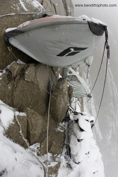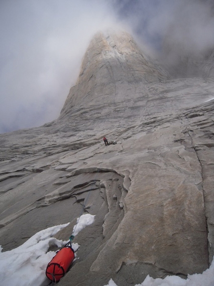 None of the days on the wall were really very good but at the same time the weather was OK enough to climb almost everyday. Some days were pretty cold and snowy. We couldn't get out of our ledges on only on 2 out of 13 days and that's pretty nice for Patagonia! Some of the higher pitches were hard to get in good free climbing condition with ice in the cracks, snow and leaking water. After reaching the summit we had to wait a few extra days to redpoint 3 pitches due to these conditions and even then we still had to jam our hands into icy cracks, which also ads to the difficulty...