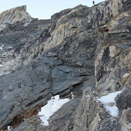 After acclimatizing and scouting the peak for a week, we established a high camp at 5,600m at the Bergschrund below the east face and acclimatized there for one more day. The approach to the bergschrund briefly crosses into the runout zone of active seracs.