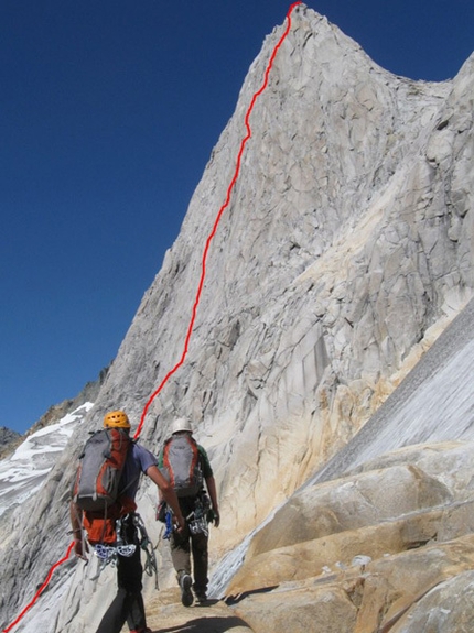 After one rappel down the south side of the formation the team was able to scramble around to the north and down climb (4th and easy 5th class) a series of complicated slabs, rappel across a snow field and returned to their high camp in 6 hours after summiting. Overall the Americans ascended 2,200 feet of roped climbing. The rock was excellent fine grained granite with a host of cracks systems mostly tips to hands in size.