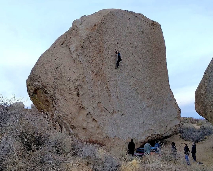 A few days ago 26-year-old Miles Adamson from Canada established an important new highball on the Grandma Peabody at the Buttermilks in Bishop (USA). This huge boulder is not to be confused with the nearby, nigh namesake Grandpa Peabody that hosts the world-famous Ambrosia highball, first climbed by Kevin Jorgeson precisely a decade ago.