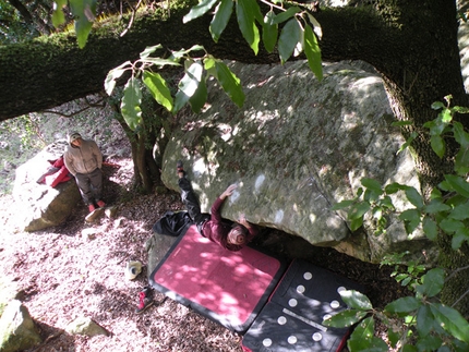 Thanks to the inexorable erosive action and the inevitable landslides a series of boulders of all shapes and sizes have created an enormous playground for climbers, and hidden deep in the forest of the Gallipoli Cognato and Campomaggiore parks lie numerous different bouldering areas. At present the biggest is located at Pietradeltoro and this boasts over 500 problems from 4C to 8B , many of which were crushed by the powerful fingers of Michele Caminati and Mauro Calibani, the latter having played an important role in developing the area right from the outset. The boulders vary in height up to 7m and great attention has been placed on preparing the landing areas, with works comparable to building the pyramids in Egypt.