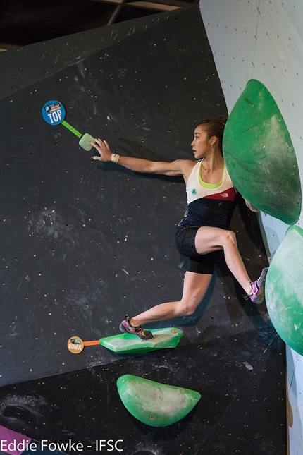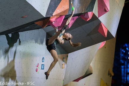 Japanese athletes dominated the Bouldering World Cup once again, with 3 + 3 athletes from the land of the rising sun qualifying for the last round. Problem #1 proved practically impossible for all except Shauna Coxsey who sent it first go, and obviously also for Janja Garnbret who, as yet in her short and brilliant career, has never missed a senior finals. Thanks to an extraordinary flash the Slovenian immediately took the lead, but on problem #2 Coxsey - a huge dyno followed by shoulder press to match on an undercling top - displayed her class flashing it effortlessly. Miho Nonaka sent it 4th go while, with just 12 seconds to go the clock suddenly reset itself while Mei Kotake was about to match the top. A technical incident was called and after a short break the Japanese climber was given another 2 minutes to complete the problem, but although getting heartbreakingly close she failed to top out. Garnbret sent this problem 4th go to take the lead once again. Problem #3 proved decisive: Coxsey needed four goes to match the top and, under pressure for the first time, Garnbret failed and didn’t even manage to reach the bonus zone. This lead to the final problem which, for Coxsey, proved a mere formality. The Brit took her second victory this year while Garnbret settled for second; there can be no doubt that the duel between these two will continue for the rest of the season. Mio Nonaka took third, ahead of a surprising Jain Kim, the queen of lead competitions, who on the final problem executed a textbook figure-of-four to beat Aya Onoe and the unfortunate Mei Kotake, fifth and sixth respectively.