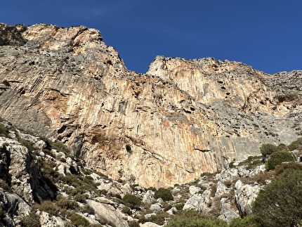 From a climbing perspective, Kalymnos was first "discovered" in 1996 when Italy's Andrea Di Bari visited the island with his wife for some snorkling around Pothia. On their last day, he hired a scooter to explore the rest of the island and stumbled across the huge sheets of unclimbed rocks. He immediately realised the vast potential and returned 12 months later with a group of friends; armed with 600 bolts, they established the first 43 sport climbs, in the sectors Arhi, Odyssey and Poets. Articles written by photographer Andrea Gallo soon appeared in the climbing magazines Alp and Rotpunkt. The rest is history. The most recent climbing guidebook, authored by local experts Katie Roussos and Aris Theodoropoulos, features over 4000 climbs.