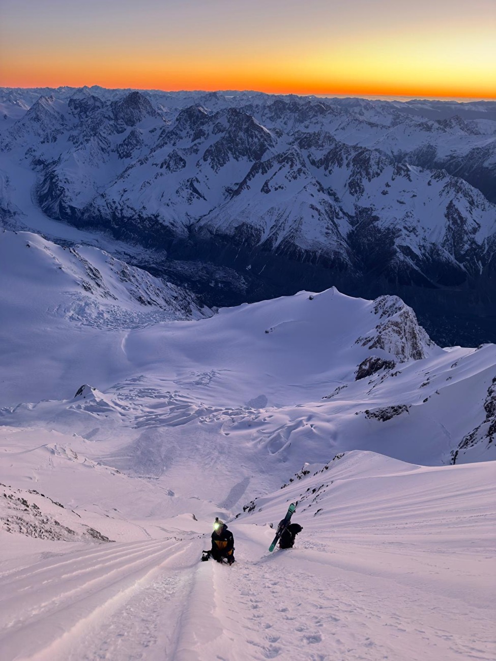 Sam Smoothy and Ross Hewitt making the first ski descent of the 'Jones Route' on the east face of Aoraki / Mt Cook, New Zealand on 01/11/2025