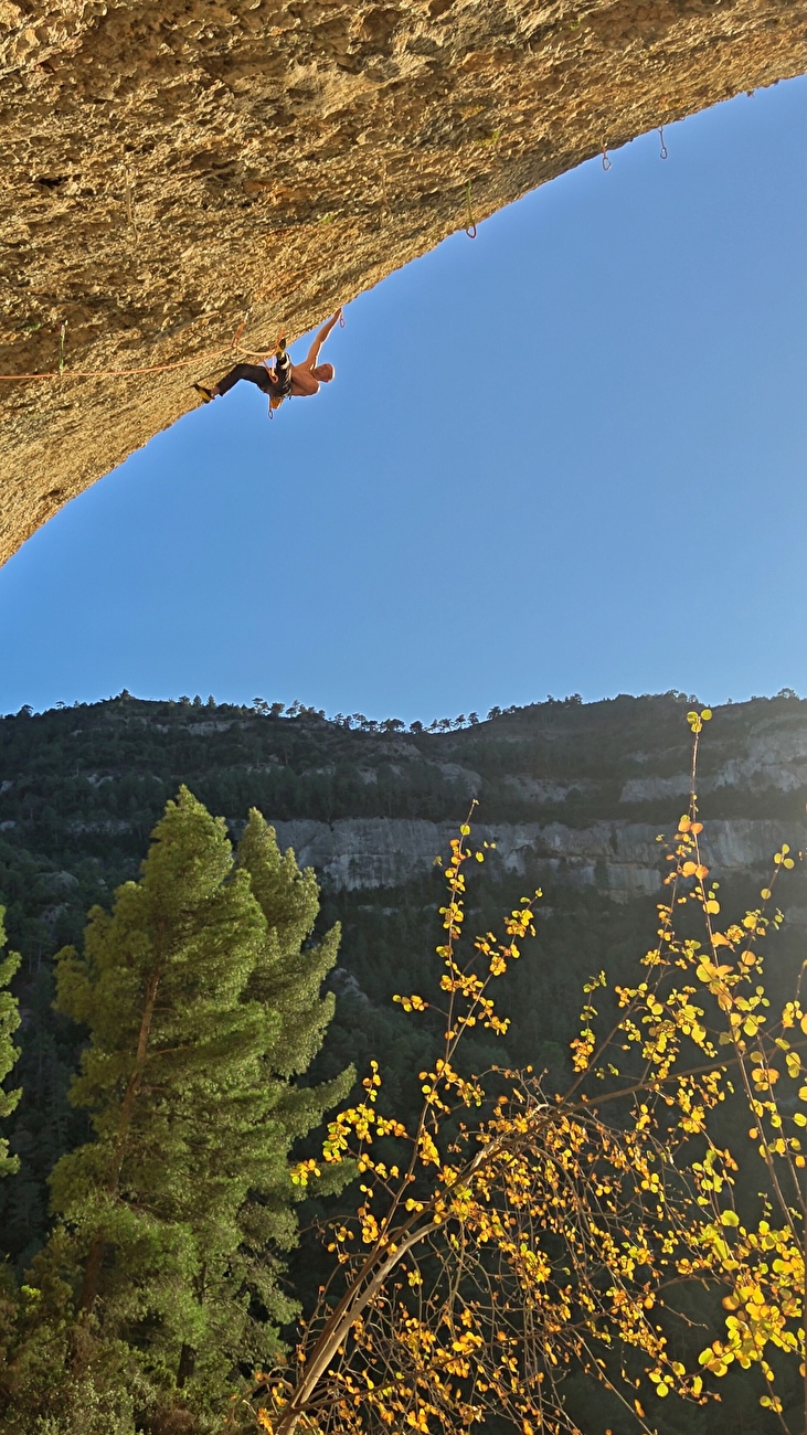 Iker Pou climbing 'Witch Hunter' (9a) at Margalef, Spain, autumn 2025