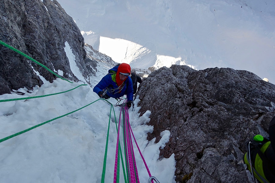 Luka Lindič seconding Ines Papert while making the first repeat of Selvaggia sorte, Cima Tosa (Brenta Dolomites)