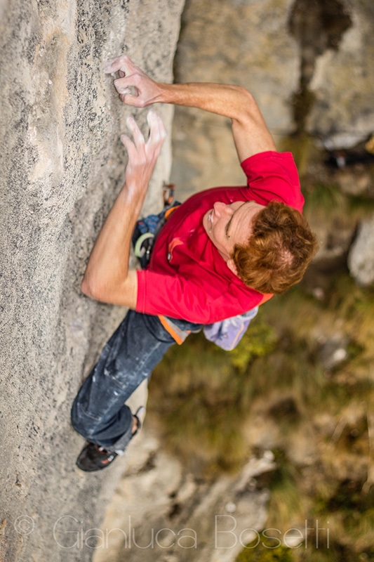 It was a real "life experience" that lasted several years. I started trying the route by chance, I'd never been to Cornalba before but knew about the route having seen a video of Adam and I wanted a project for that winter. Soon though I realised that winter wasn't the best time of year for that route, way too cold and windy. But I'd become obsessed and after just a few days of attempts felt close to the redpoint. But whenever I reached the crux I lost all feeling in my fingers. So I returned the following season, in autumn, but wasn't particularly fit and getting in tune with the route took a while. This delay proved costly and once back in shape the cold finger problem retuned. One day I somehow pushed on through the crux, only to fall off the finishing slab with completely numb hands.