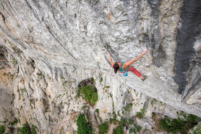 Nina Caprez climbing Hélix au pays des merveilles 8c+ at Pic Saint Loup in France.