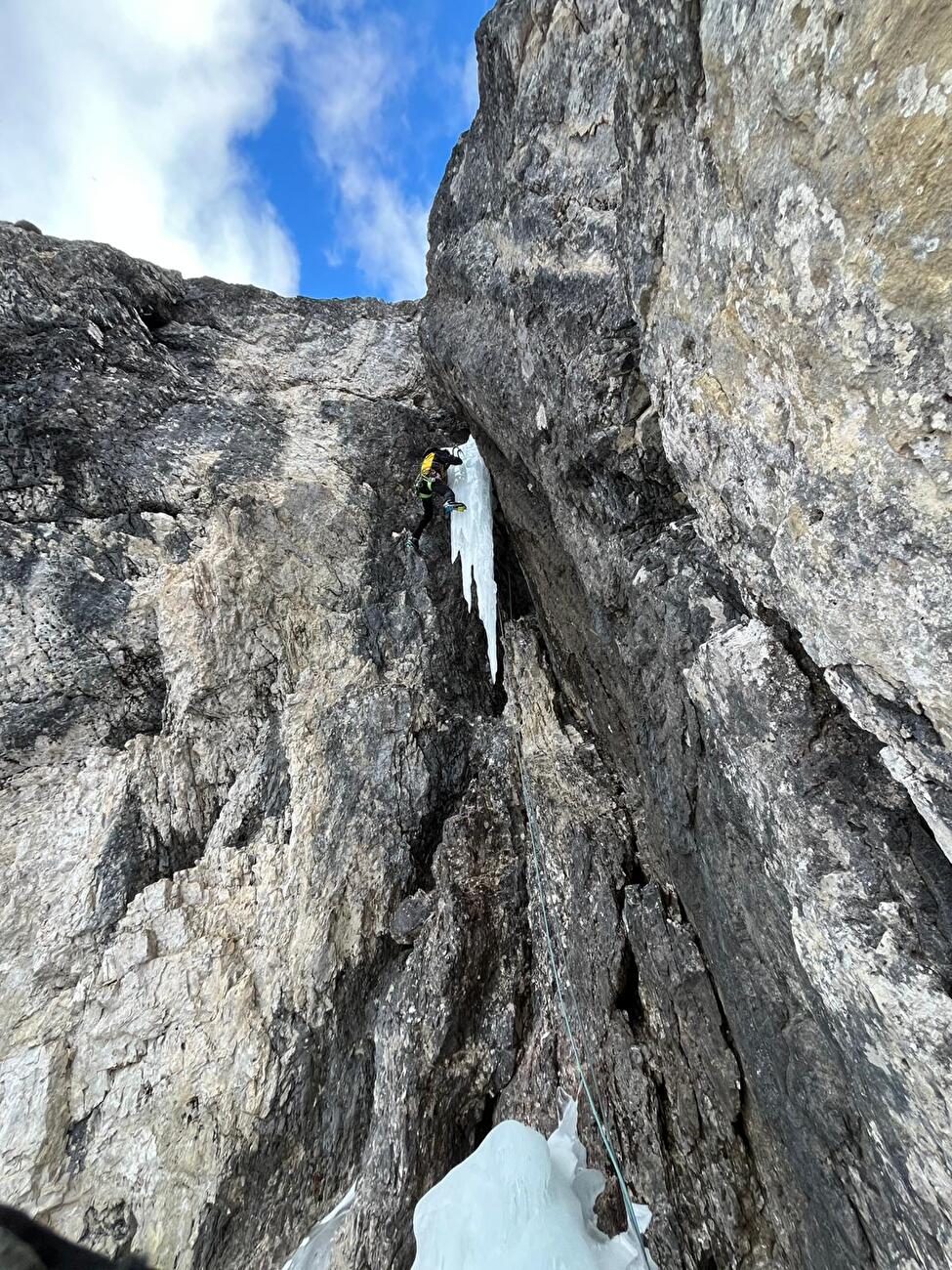 The first ascent of 'Out of the Dark' on the north face of Laserz, Lienzer Dolomites, Austria (23/01/2026 Simon Gietl, Vittorio Messini)