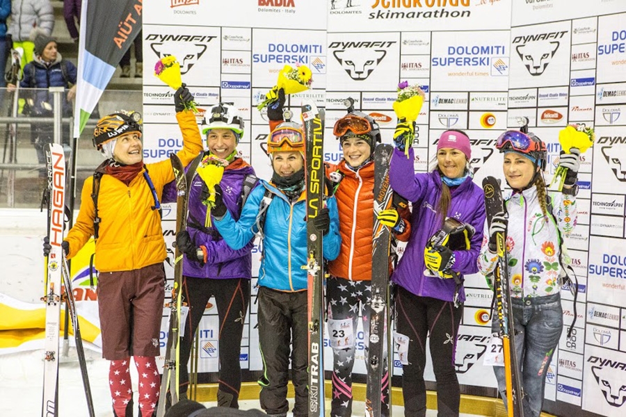 Female podium Sellaronda Ski Marathon 2016: 1. Raffaella Rossi - Bianca Balzarini 2. Katarina Zipser - Verena Krenslehner, 3. Dimitra Theocharis - Cecilia De Filippo