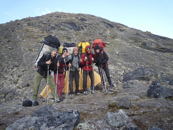 Mt. Asgard Baffin Island: the team, from left to right: Stephane Hanssens, Olivier Favresse, Nico Favresse, Sean Villanueva and Silvia Vidal.