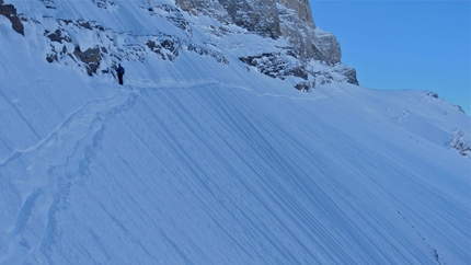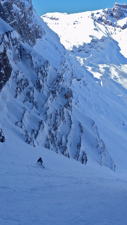 Seb has a great eye for finding new ski lines and he invited me along to try the north face of Dent Favre. We started the day with a 250 meter skin from the lifts in Ovrannaz and then dropped in on the other side. The line starts with a long, beautiful and exposed traverse and then joins a "hidden" couloir. We had to do one short rappel to get in and one short rappel to get out of the couloir. From below we saw that at least the first one could have been circumvented.