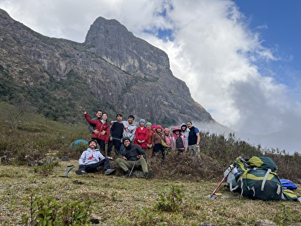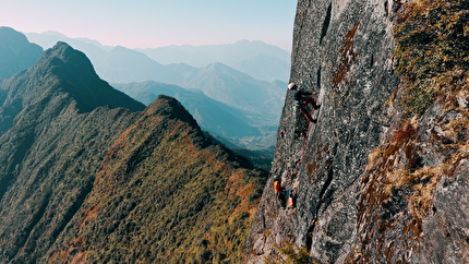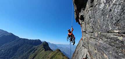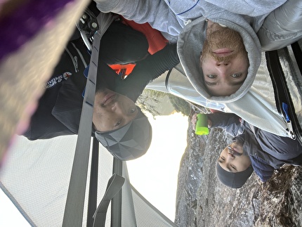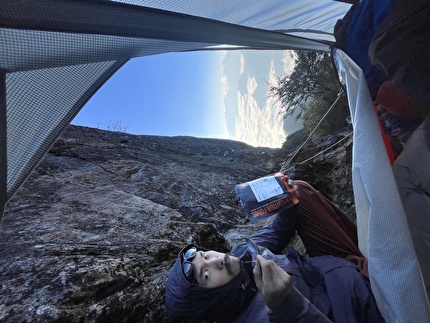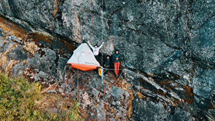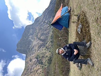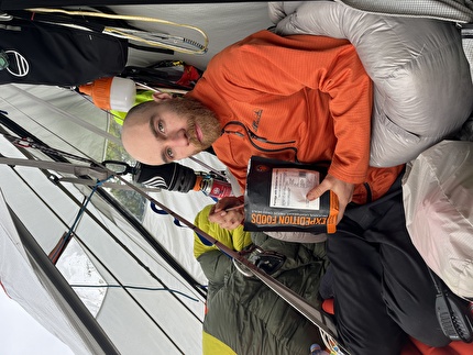 Connor Herson with his rack after making the first ascent of 'Drifters Escape' (5.15a/9a+)...