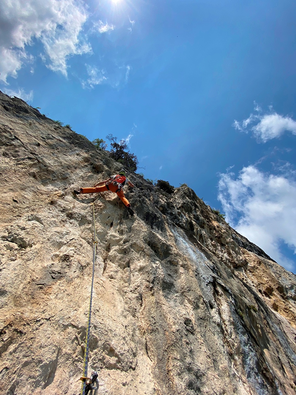 Establishing pitch 6 of 'Transgemica', Pale Basse - Monte Cimo, Val d'Adige (Matteo Rivadossi, Davide Dallera, Cristina Oldrati, Davide Iotti marzo/aprile 2024)