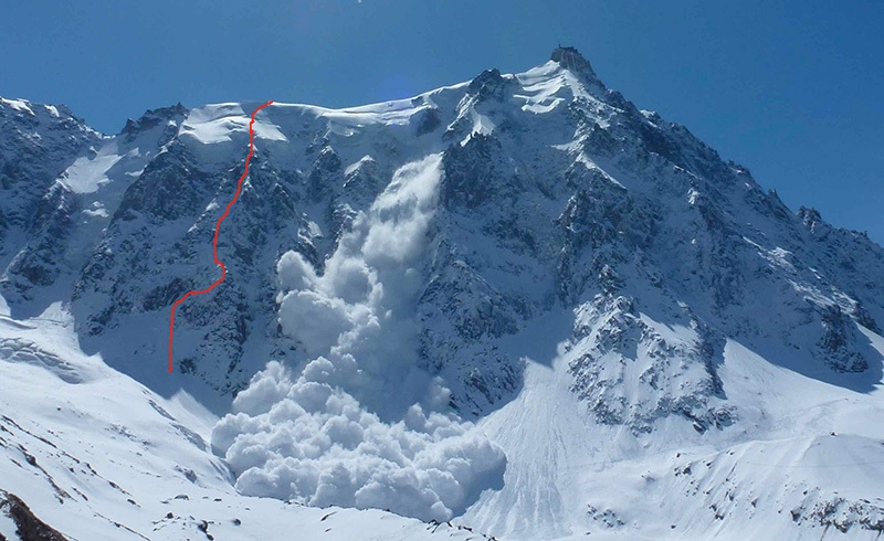An archive photo of Éperon des Jumeaux and the line of descent taken by Julien Herry and Raph Bonnet on 03/06/2014.