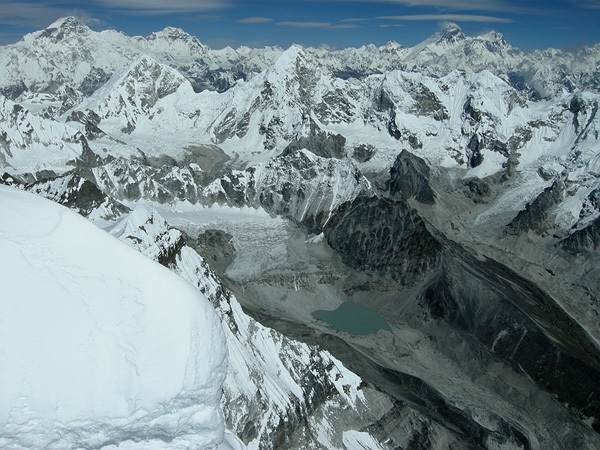 The view east from the summit of Kang Nachugo, Himalaya. Cho Oyu, Everest and Lhotse can be seen in the distance.