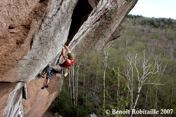 Jean-Pierre Ouellet climbing La Zébrée 8b+ Mont-King, Canada
