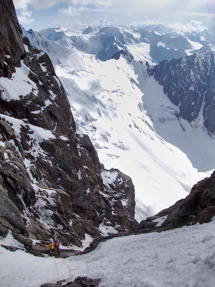 Grisha Chsukin following the last hard sections on the west face of Peak Trud in Kazakhstan