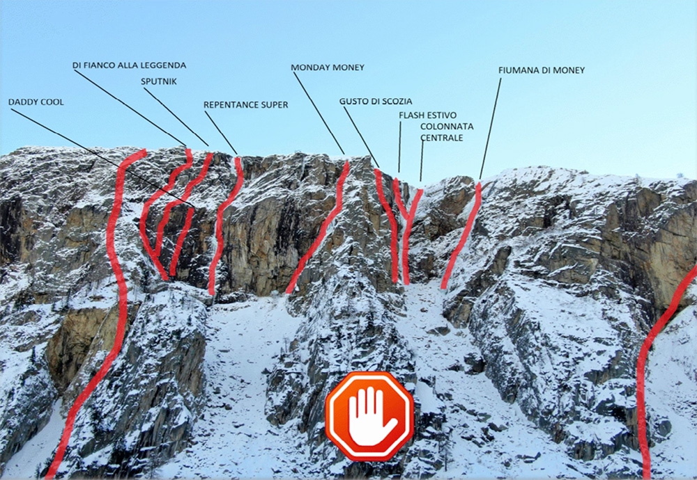 The area where ice climbing is prohibited in Valnontey (Cogne) in order to protect the Bearded Vulture. The banned ice climbs are: Di fianco alla leggenda, Sputnik, Daddy Cool, Repentance Super, Monday money, Gusto di Scozia, Flash estivo, Colonnata Centrale, Fiumana di Money