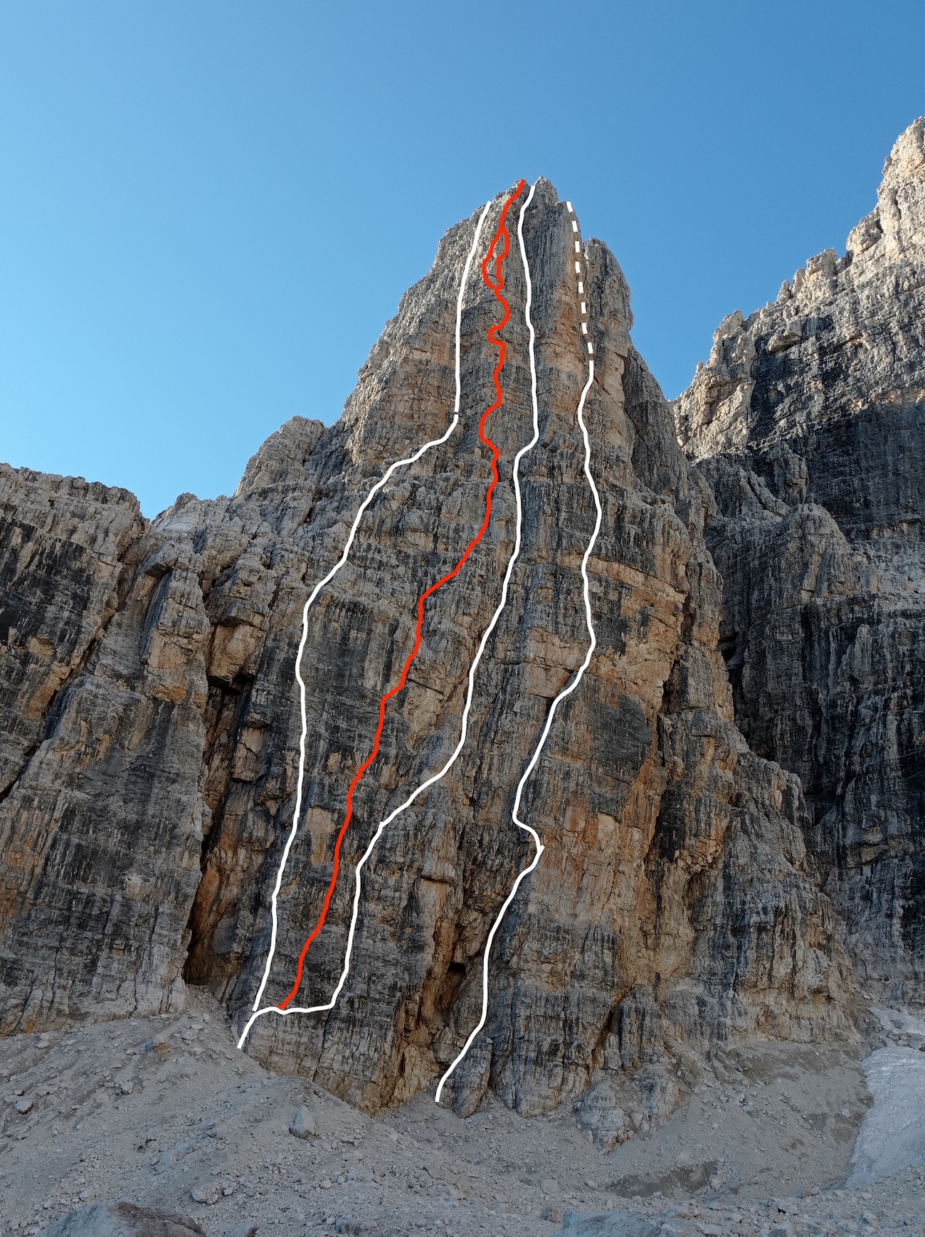 Torre d’Ambiez in the Brenta Dolomites. From left to right: Via Anna, Via Lisa, Diedro Armani, Via Silvio Chini