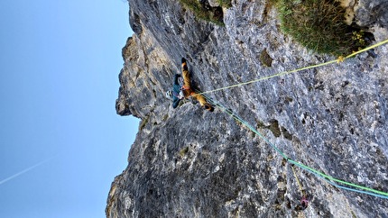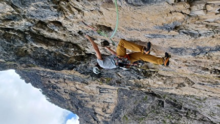 The first ascent of 'Tutto cambia': Thomas Gianola opening the seventh pitch