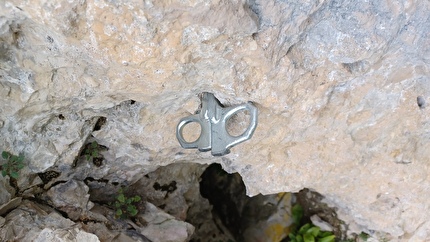 The first ascent of 'Tutto cambia: pitons paired on one of the central pitches