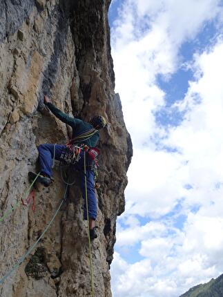 The first ascent of 'Baila Morena': sixth pitch (Corno del Framont, Moiazza, Dolomites)