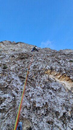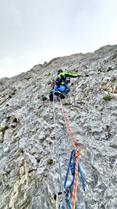 Ginevra Calandrella in belay on the fourth pitch of 'Imagine... all the people', Scoglio...