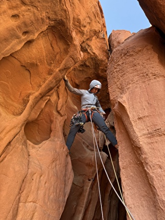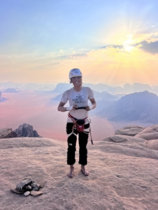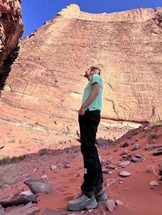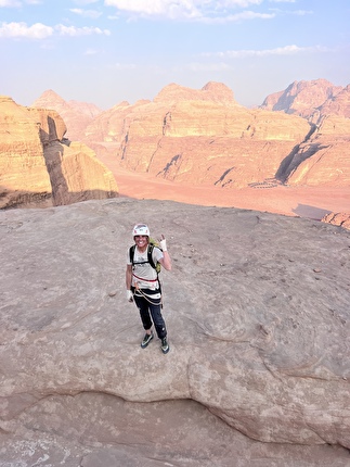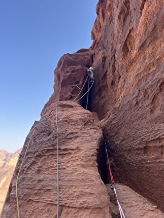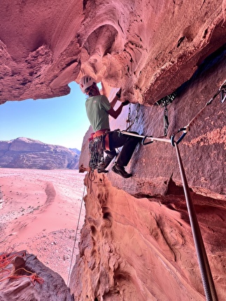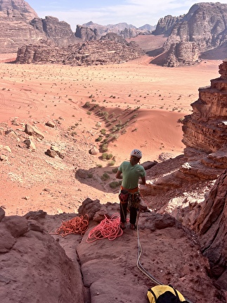 The first ascent of ‘Mukatila’ on Jebel Nassrani South at Wadi Rum in Jordan...